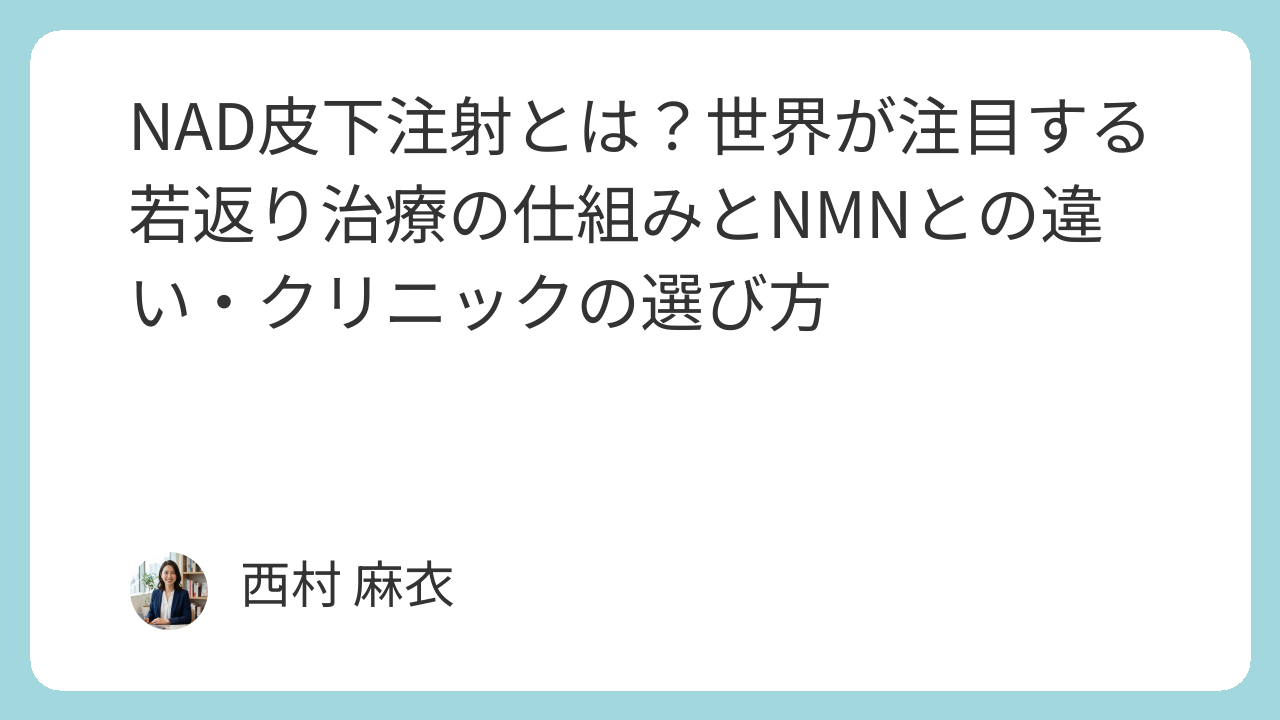 - NAD皮下注射は国内で提供できるクリニックが極めて少ない。製剤の正規代理店契約の有無が選択の第一基準。